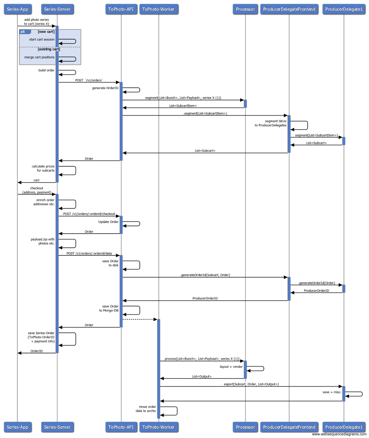 The App gives a segment order to the to.photo API via the Series server. This order has information about the used images, including sizes and meta data (which design, text, etc.). Additionally the order specifies a Processor, this implies which products will be segmented. A processor is a domain specific implementation of a product. The API generates an OrderID and determines, based on the processor, how many pictures would be generated and whether additional data would be added. The cart now holds the calculated amount of products.